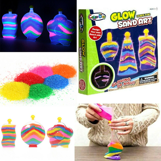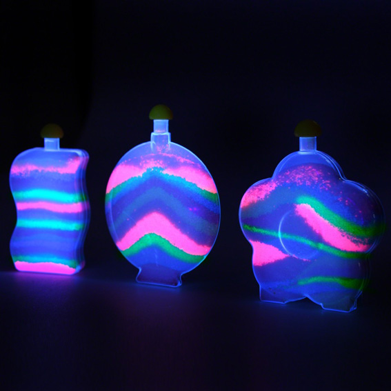 Sami po svojoj kreaciji sipate pesak u boce.Pesak specijalne teksture(kristalne),svetli u mraku.